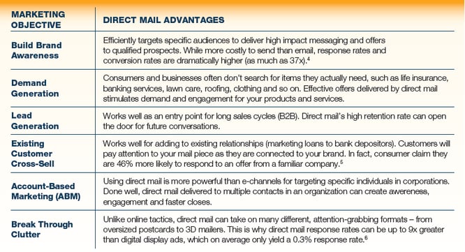 Direct mail offers several advantages for achieving marketing objectives. When combined with effective strategy and other tactical elements, direct mail can be instrumental in driving the success of a campaign.